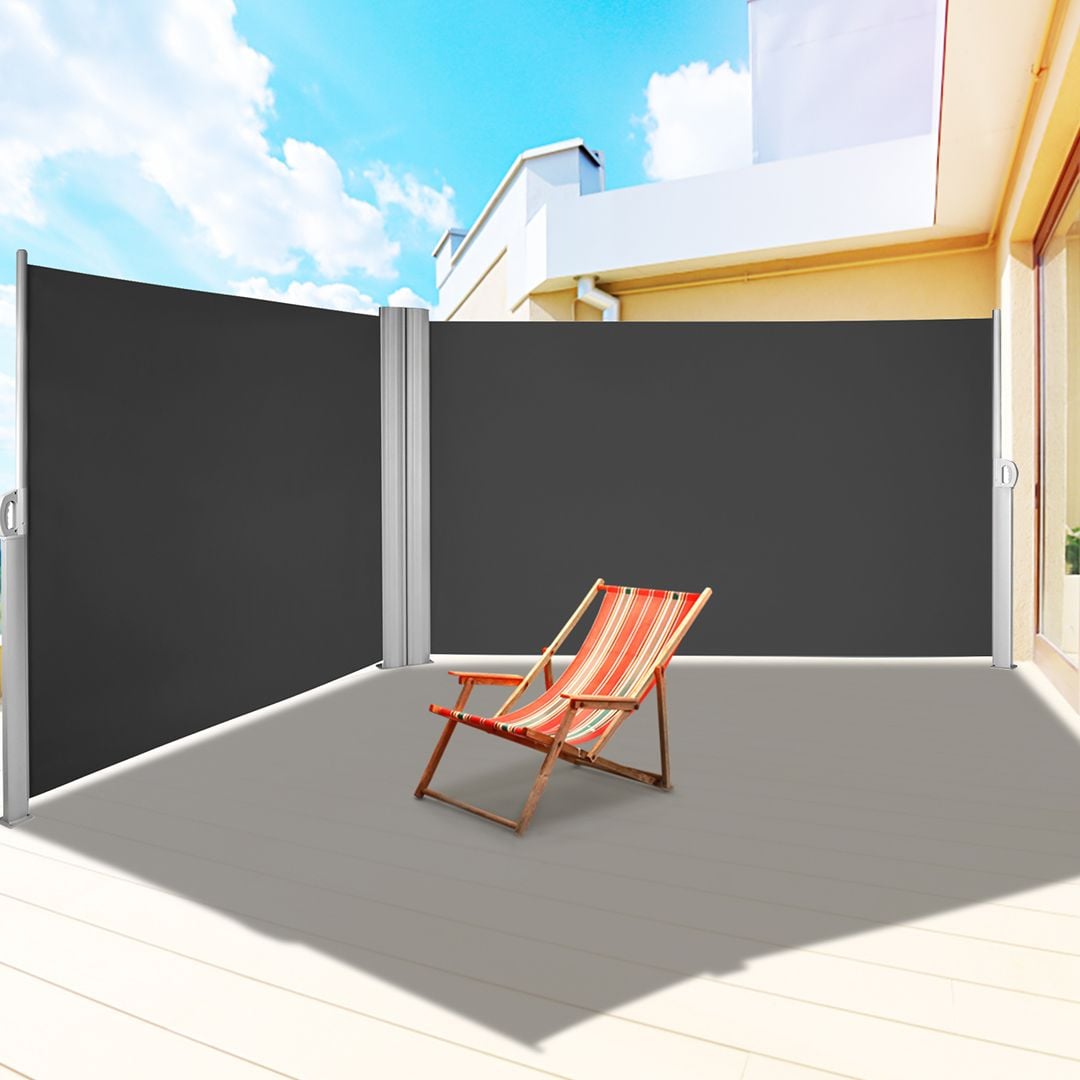 مظلة جانبية من نسيج البوليستر القابل للتنفس، مقاوم للماء و مقاومة للأشعة فوق البنفسجية يتميز السياج القابل للسحب بإطار معدني من الألومنيوم المؤكسد ونسيج البوليستر مع طلاء بولي coating لمقاومة الماء يمكن استخدامها من الجهتين للخصوصية والحماية من الأشعة فوق البنفسجية يتوفر مع الأوتاد أسافين و براغي لتثبيتها في الأرض وشبكها حسب المكان الذي تريد يمكن نصبه عند بركة السباحة او في الفناء او في الحديقة او على التراس يتميز بمقبض قابل للسحب بتصميم نابض، مما يجعله يدخل في العمود بسلاسة ويضيف ثباتًا إضافيًا للمظلات الجانبية يتم إرجاع المظلة إلى أسطوانة الألمنيوم لسهولة التخزين يتوفر مع المظلة ملحقات واكسسوارات التركيب ، سهلة التركيب و التثبيت متوفر باللون الرمادي