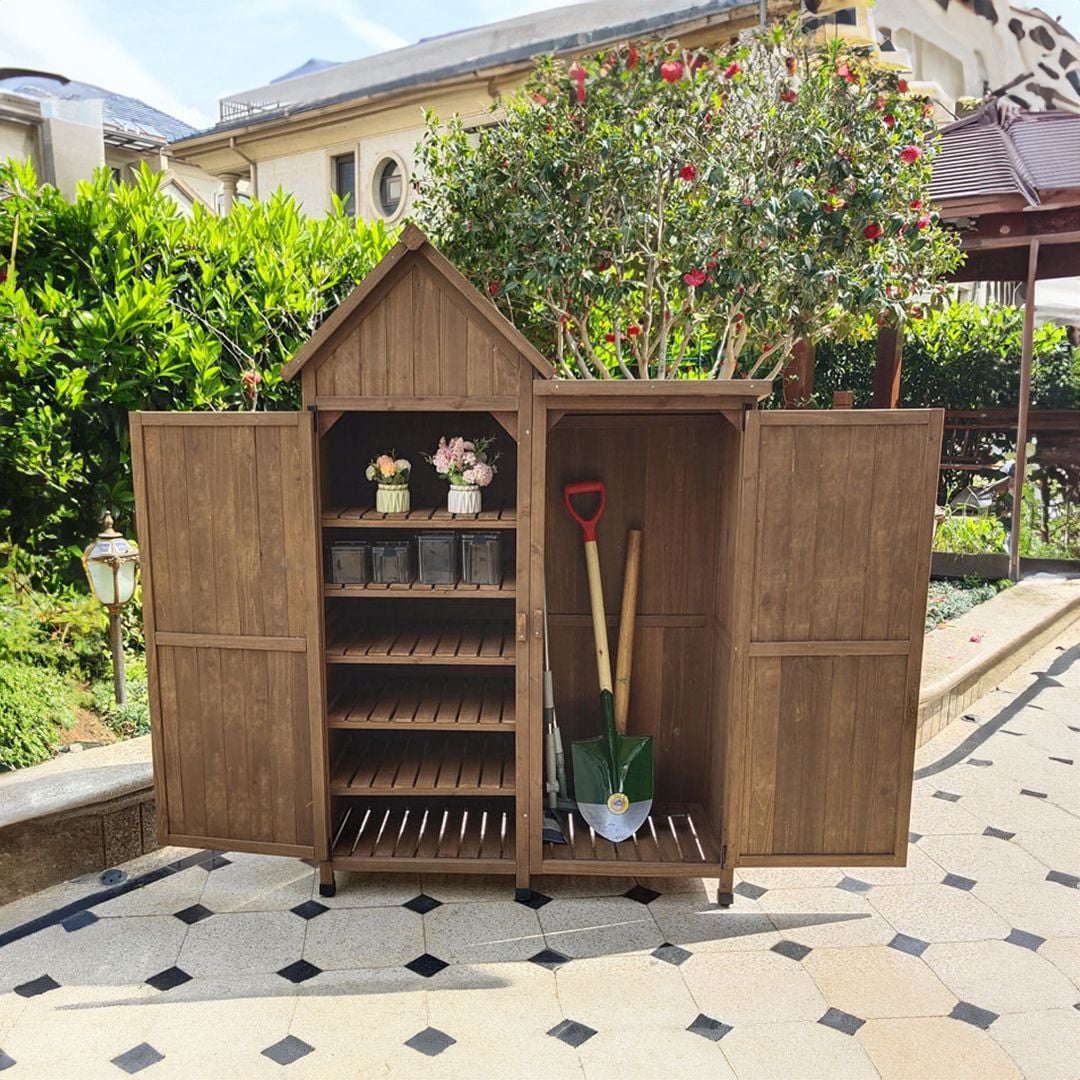 خزانة خشبية للتخزين الخارجي مصصمة بأبواب مزدوجة و5 رفوف قابلة للتعديل والفصل هيكل متين مصنوع من خشب الأرز عالي الجودة والمقاوم للتلف والتآكل لتحمل الظروف الجوية الخارجية كما تحتوي على 4 أغطية مطاطية غير قابلة للانزلاق على الأرجل للحفاظ على ثباتها على الأرض وحماية الأرجل الخشبية من الظروف الرطبة تتميز بسعة تخزين كبيرة لتناسب الأحجام والأشكال المختلفة للأدوات الزراعية كما يمكن تعديل الرفوف والارتفاع بين كل رف أو إزالتها بالكامل بما يتناسب مع احتياجاتك مثالية للحدائق والمزارع فهي تضيف لمسة ريفية للمكان بالإضافة لكونها أداة لتخزين وحفظ لجميع مستلزماتك الزراعية سهلة التجميع فهي تأتي مع تعليمات تجميع مفصلة وأدوات تركيب وألواح خشبية وعدة أنواع من البراغي، والتي يمكن التعرف عليها بسهولة